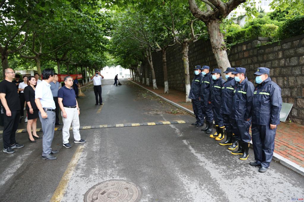 胡金焱現場檢查了浮山校區科技研發大樓地下停車場、浮山校區寧德路、青大路和金家嶺校區科大支路等三個地下人防通道、浮山校區防汛安全應急巡邏點、危化品倉庫、匯園一號學生公寓、浮山校區東院教學實驗樓施工現場、浮山校區慧湖和金家嶺校區劍湖等防汛安全重點區域和部位,并就我校防汛安全工作提出專業防汛、科學防汛、前置防汛三項工作要求。