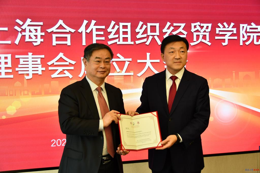 會議成立中國—上海合作組織經貿學院理事會,審議通過了理事長、副理事長及理事會成員名單。劉建軍和胡金焱當選為理事長。校長夏東偉擔任中國—上海合作組織經貿學院首任院長。夏東偉表示,將胸懷“國之大者”,強化使命擔當,在理事會的領導下,按照《章程》的有關要求,忠實履職盡責,加快學院建設,積極推動政策溝通、貿易暢通、資源互通、科技聯通、民心相通、健康理念融通,將學院打造成具有國際影響力的經貿研究、人才培養和產學研深度融合的開放新平臺。
