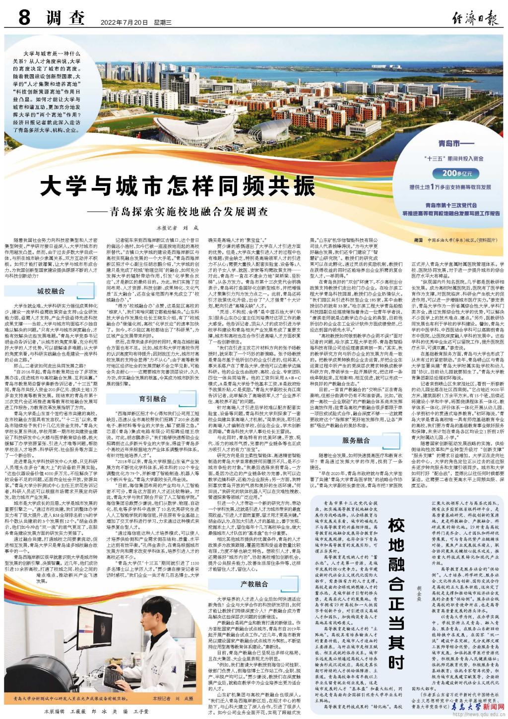 新聞網(wǎng)訊 7月20日,《經(jīng)濟(jì)日?qǐng)?bào)》記者劉成發(fā)表“大學(xué)與城市怎樣同頻共振——青島探索實(shí)施校地融合發(fā)展調(diào)查”,以青島大學(xué)為例從城校融合、育引融合、產(chǎn)教融合、服務(wù)融合四個(gè)方面深入分析了大學(xué)與城市的關(guān)系。