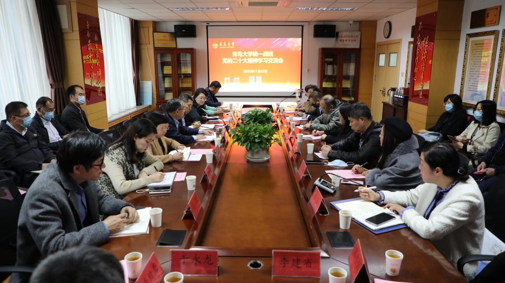 民革青島大學支部主委張波濤、民盟青島大學基層委主委徐巖、民建青島大學總支副主委王振光、民進青島大學總支主委王靜怡、農工黨青島大學基層委副主委徐文華、致公黨青島大學基層委副主委張之峰、九三學社青島大學基層委主委隋坤艷、無黨派代表人士張蓓分別結合實際就學習情況進行了交流發言。大家表示,要用黨的二十大精神武裝頭腦,指導實踐,更加緊密地團結在以習近平同志為核心的黨中央周圍,深刻領悟“兩個確立”的決定性意義,增強“四個意識”、堅定“四個自信”、做到“兩個維護”,充分發揮統一戰線人才薈萃、智力密集的優勢,踔厲奮發,勇毅前行,奮力推動學校事業不斷實現高質量發展。