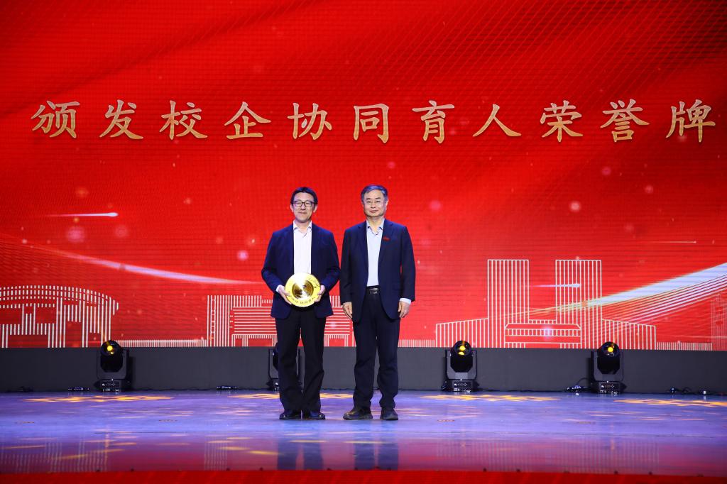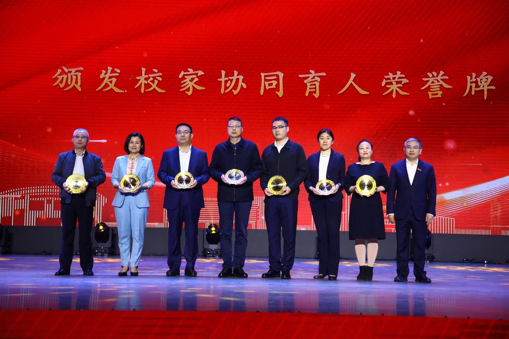 校黨委書記胡金焱為特別邀請的7名獲獎學子的家長贈送“校家協同育人榮譽牌”,校長夏東偉為青島啤酒集團有限公司頒發“校企協同育人榮譽牌”。