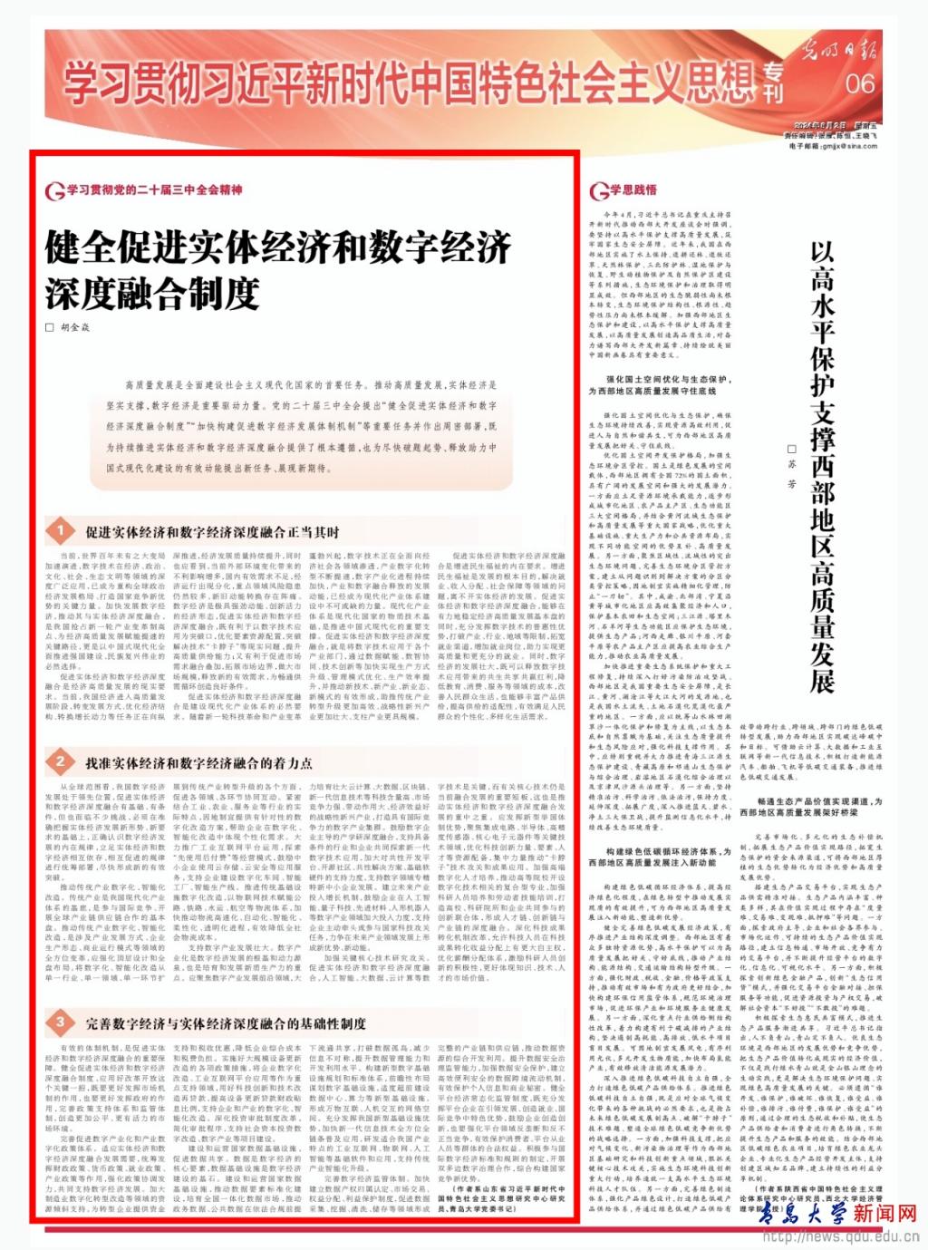新聞網(wǎng)訊 8月2日,《光明日?qǐng)?bào)》刊登我校黨委書記胡金焱關(guān)于“學(xué)習(xí)貫徹黨的二十屆三中全會(huì)精神”專題文章《健全促進(jìn)實(shí)體經(jīng)濟(jì)和數(shù)字經(jīng)濟(jì)深度融合制度》。