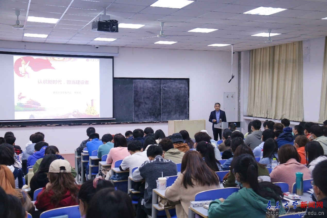 新聞網(wǎng)訊 10月24日上午,校黨委書記胡金焱在浮山校區(qū)博學(xué)樓101教室以“認(rèn)識新時代,擔(dān)當(dāng)建設(shè)者”為題,為2019級臨床醫(yī)學(xué)150余名本科生講授《形勢與政策》課。