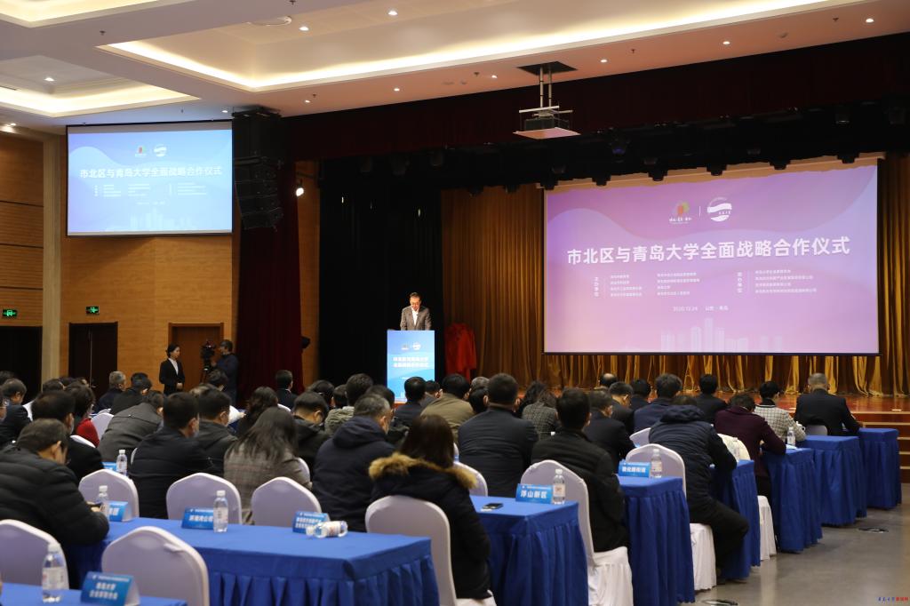 胡金焱在致辭中表示,近期,我們見(jiàn)證了市北區(qū)一輪輪不斷的自我迭代和升級(jí),從5大賽場(chǎng)、17條賽道到“1+6+N”的產(chǎn)業(yè)布局,特別是12月1日,市北區(qū)正式發(fā)布RCEP青島經(jīng)貿(mào)合作先行創(chuàng)新試驗(yàn)基地建設(shè)方案,吹響了老城區(qū)高質(zhì)量發(fā)展的集結(jié)號(hào)。青島大學(xué)學(xué)科門(mén)類(lèi)齊全,人才、科研優(yōu)勢(shì)突出,青島大學(xué)與市北區(qū)政府的合作,具有良好的合作前景,更有共同的合作意愿。在學(xué)校合作發(fā)展處與市北區(qū)產(chǎn)業(yè)發(fā)展專(zhuān)班摸清雙方資源和需求的前提下,合作雙方高度重視、頂格推進(jìn)、多方協(xié)同、成立專(zhuān)班對(duì)接推動(dòng)合作項(xiàng)目,充分發(fā)揮青島大學(xué)企業(yè)家聯(lián)合會(huì)、四方招商產(chǎn)業(yè)發(fā)展有限公司的資源優(yōu)勢(shì)形成政產(chǎn)學(xué)研深度融合的有效合力,力求把論文和科研成果真正寫(xiě)在城市發(fā)展的進(jìn)程中。
