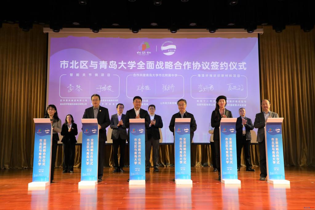 儀式現(xiàn)場(chǎng)發(fā)布了青島大學(xué)與市北區(qū)合作項(xiàng)目清單,根據(jù)具體合作方向,合作項(xiàng)目分為醫(yī)療健康、科技創(chuàng)新、基礎(chǔ)教育、文化旅游以及“三新”產(chǎn)業(yè)五大板塊,共353個(gè)擬合作項(xiàng)目。隨后,青島大學(xué)與市北區(qū)簽署全面戰(zhàn)略合作協(xié)議,同時(shí)進(jìn)行了合作共建青島大學(xué)市北附屬中學(xué)、智能關(guān)節(jié)鏡、海藻纖維紡織新材料等項(xiàng)目的現(xiàn)場(chǎng)簽約。此外,現(xiàn)場(chǎng)還進(jìn)行了青島青北科創(chuàng)投資集團(tuán)有限公司、青島大學(xué)基礎(chǔ)教育研究院、青島大學(xué)新金融研究院、青島大學(xué)青島醫(yī)學(xué)院科研成果轉(zhuǎn)化基地、“青島里院”寫(xiě)生基地等5個(gè)項(xiàng)目的揭牌儀式。