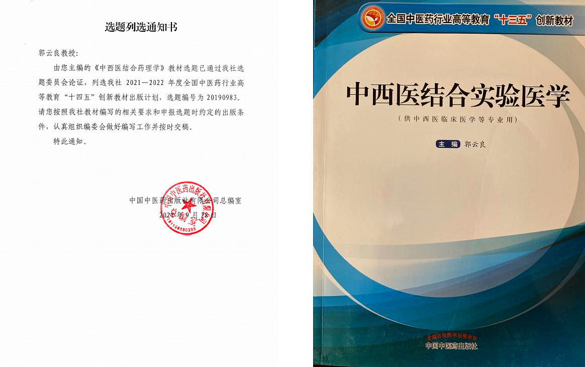 新聞網訊 由醫學部中西醫結合中心郭云良教授組織申報的《中西醫結合藥理學》選題,已通過中國中醫藥出版社選題委員會論證,正式列選2021-2022年度全國中醫藥行業高等教育“十四五”創新教材出版計劃(20190983)。預計2023年6月正式出版。
