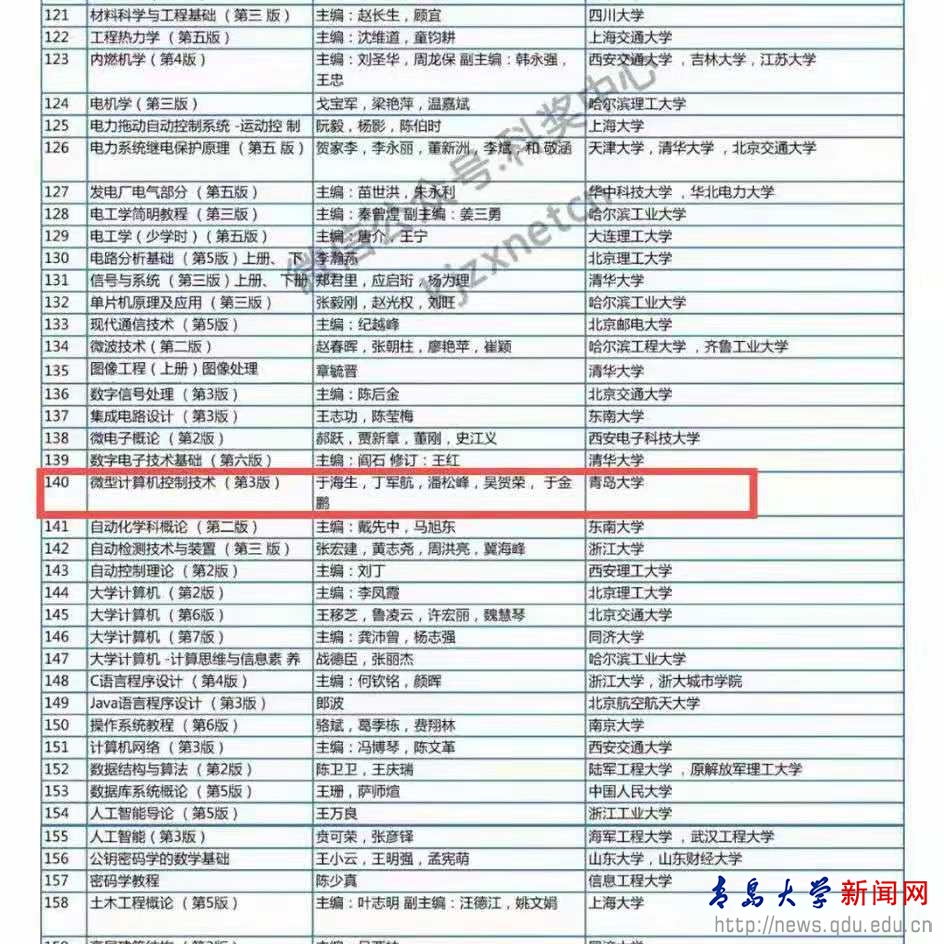 新聞網(wǎng)訊 日前,教育部網(wǎng)站公布了國家教材委員會關(guān)于首屆全國教材建設(shè)獎獎勵的決定。我校于海生、丁軍航、潘松峰、吳賀榮、于金鵬編寫的《微型計算機控制技術(shù)(第3版)》獲“全國優(yōu)秀教材二等獎”。