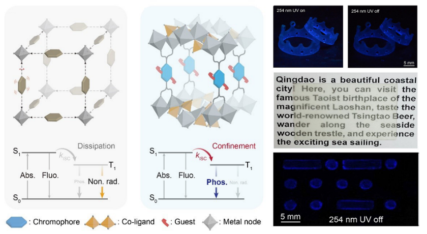室溫磷光材料在顯示照明、生物成像、信息安全等領域應用廣泛。目前開發的室溫磷光材料家族中,磷光顏色主要集中在黃綠色區且磷光量子效率較低。針對這一前沿難題與研究瓶頸,王國明教授提出“以金屬有機骨架為模型的配體功能化”組裝設計策略,通過結構設計構建出金屬膦鹽雜化層作為輔助,誘使發光配體呈現單分散態,調控材料的發光顏色藍移;在此基礎上,通過配位“錨定”和主客體作用“協同”限制發光配體分子的振動轉動,達到提高材料磷光量子效率的目標,本研究報道的室溫磷光材料具有高達80.6%的藍色磷光量子效率及長達169.7 ms的壽命。這為設計、合成高效RTP材料提供了普適性原理,也賦予了傳統金屬有機框架材料新的應用潛力,制備的新材料可應用于3D打印技術、高端防偽和指紋可視化等方面。