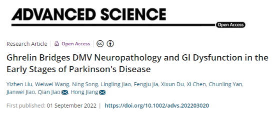 新聞網(wǎng)訊 帕金森病(Parkinson’s disease,PD)是全球第二大神經(jīng)退行性疾病,我國60歲以上人群的發(fā)病率是1.37%,隨著我國步入人口老齡化社會,其患病人數(shù)逐年增加。近日,基礎(chǔ)醫(yī)學(xué)院姜宏教授團(tuán)隊于《Advanced Science》(中科院期刊分區(qū)1區(qū),IF=17.521)在線發(fā)表了題為Ghrelin bridges DMV neuropathology and GI dysfunction in the early stages of Parkinson's disease的研究成果。該研究得到了國家自然科學(xué)基金委、山東省自然科學(xué)基金委、山東省科技廳和泰山學(xué)者工程等的資助。基礎(chǔ)醫(yī)學(xué)院生理學(xué)研究生劉一臻、王維維和基礎(chǔ)醫(yī)學(xué)院宋寧教授為第一作者;姜宏教授和焦倩副教授為該論文的共同通訊作者。