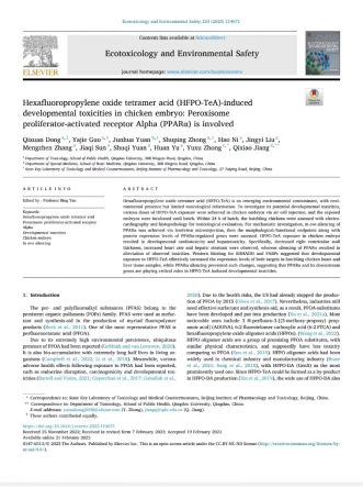 新聞網訊 公共衛生學院2019級預防醫學本科生董其軒、鐘淑萍以共同第一作者身份在Ecotoxicology and Environmental Safety(IF=7.129,中科院分區毒理一區)發表論文“Hexafluoropropylene oxide tetramer acid (HFPO-TeA)-induced developmental toxicities in chicken embryo: Peroxisome proliferator-activated receptor Alpha (PPARα) is involved” (DOI: 10.1016/j.ecoenv.2023.114671)。該研究論文由青島大學獨立完成,公共衛生學院為第一單位,學院教授姜啟曉為通訊作者。