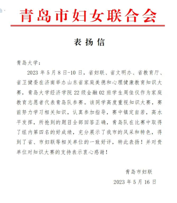 新聞網(wǎng)訊 近日,省婦聯(lián)、省文明辦、省教育廳、省衛(wèi)健委在濟南舉辦山東省家庭美德和心理健康教育知識大賽,我校經(jīng)濟學(xué)院2022級金融02班學(xué)生周佳儀作為家庭教育志愿者代表青島隊參賽,最終在比賽中取得了組內(nèi)第四名的好成績。