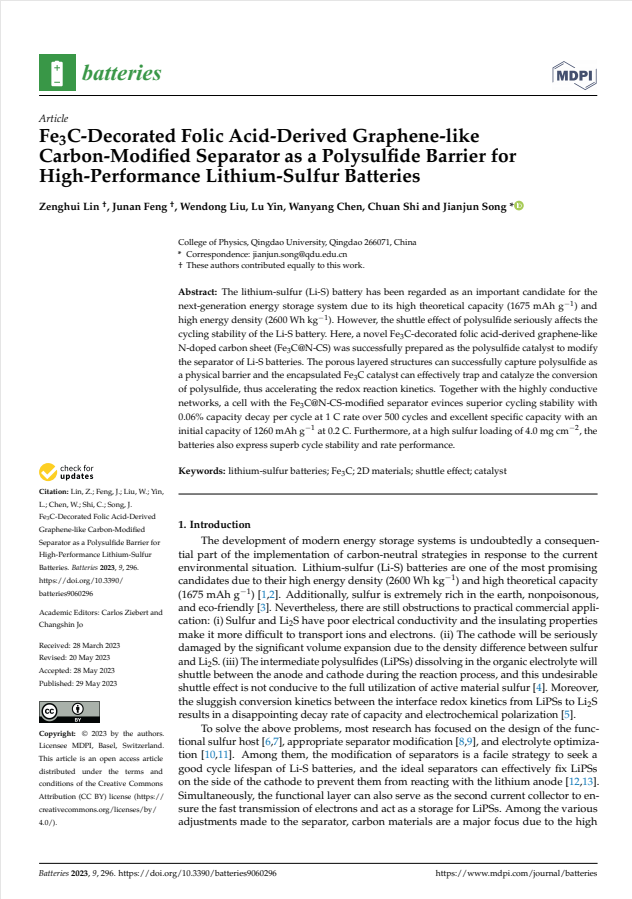 新聞網訊 近日,我校物理科學學院新能源科學與工程專業2020級本科生林增暉在國際SCI期刊Batteries(IF=5.938)以第一作者身份發表了題為“Fe3C-Decorated Folic Acid-Derived Graphene-like Carbon-Modified Separator as a Polysulfide Barrier for High-Performance Lithium-Sulfur Batteries”的研究論文(Batteries,2023, 9, 296。DOI:10.3390/batteries9060296)。青島大學系該研究論文獨立完成單位,研究生馮俊安為共同第一作者,論文通訊作者為特聘教授宋建軍。