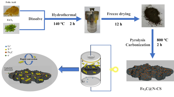 該工作以葉酸為前驅體,制備了Fe3C修飾的二維碳納米片用于改性鋰硫電池商用隔膜,提升了多硫化物的轉化反應動力學,抑制了穿梭效應,顯著提高了鋰硫電池的循環穩定性。