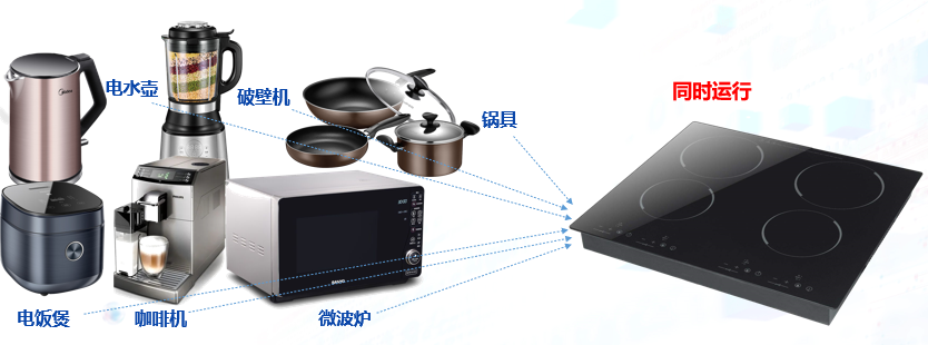 創新1:提出一種廚房電器的無線恒壓供電與加熱復用技術,電磁爐的鍋具及電飯煲、微波爐、破壁機等其它廚房電器共用電磁爐作為發射源,成本低、利用率高。