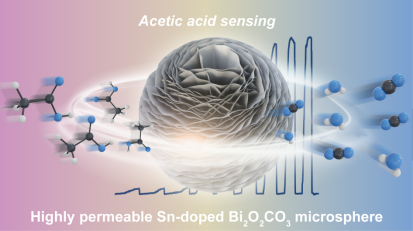 由于乙酸(CH3COOH)在化工、醫(yī)療和餐飲行業(yè)的廣泛應(yīng)用,在多場景下選擇性地檢測醋酸是具有重要意義的。近期,基于金屬氧化物半導(dǎo)體(MOS)的化學(xué)電阻式氣體傳感器已被廣泛用于檢測各種氣體,但仍需要開發(fā)具有新型納米結(jié)構(gòu)的MOS以提高其氣體傳感性能。本研究通過調(diào)控水熱反應(yīng)中配體的動力學(xué)平衡,一步合成了具有高滲透性層狀結(jié)構(gòu)的錫(Sn)摻雜次碳酸鉍(Bi2O2CO3,簡稱BCO)微球。其中,基于3 at%Sn摻雜BCO微球的氣體傳感器顯示出優(yōu)異的傳感性能。此外,通過原位紅外光譜(in-situDRIFTS)發(fā)現(xiàn)了全新的乙酸氣體傳感反應(yīng)機理;同時通過密度泛函理論(DFT)揭示了Sn摻雜策略在乙酸傳感中的重要作用。本研究為 Bi基半導(dǎo)體材料的各種應(yīng)用(如化學(xué)電阻傳感、催化、能量存儲和轉(zhuǎn)換)提供了簡易的合成路線、巧妙的納米結(jié)構(gòu)設(shè)計和充分的機理研究。