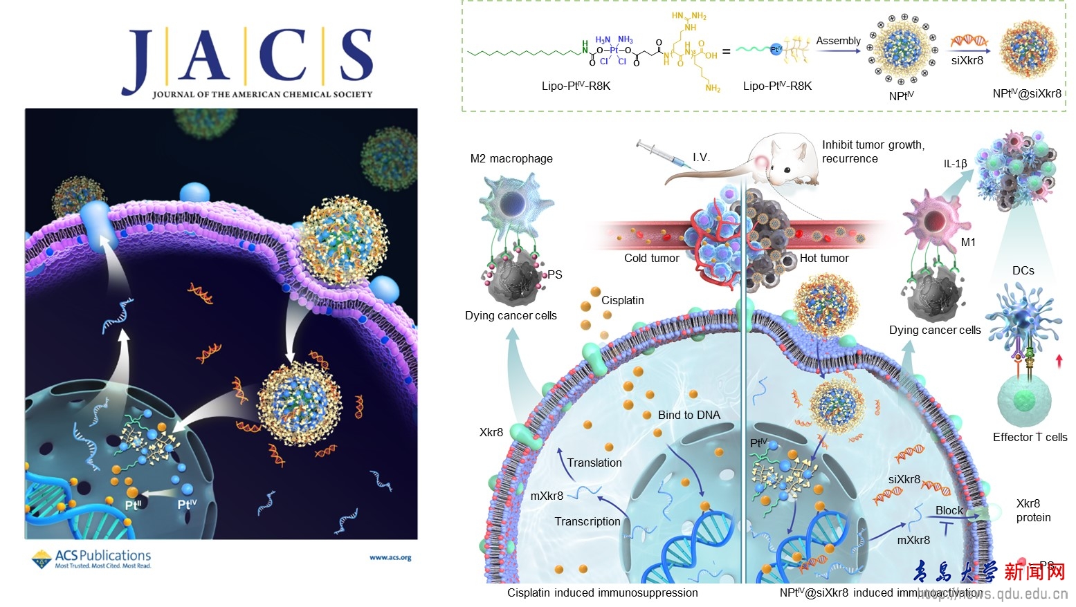 新聞網訊 近日,我校藥學院孫勇教授和中國科學院化學研究所肖海華研究員合作,在鉑藥核靶遞送和免疫增強研究方面取得最新研究進展。相關研究成果近期以“Nuclear-Targeting Lipid PtIVProdrug Amphiphile Cooperates with siRNA for Enhanced Cancer Immunochemotherapy by Amplifying Pt-DNA Adducts and Reducing Phosphatidylserine Exposure”為題發表在Journal of the American Chemical Society(JACS,DOI:10.1021/jacs.3c12706)作為封面文章。本文第一作者為青島大學藥學院青年教師魏登帥,通訊作者為孫勇教授和肖海華研究員。