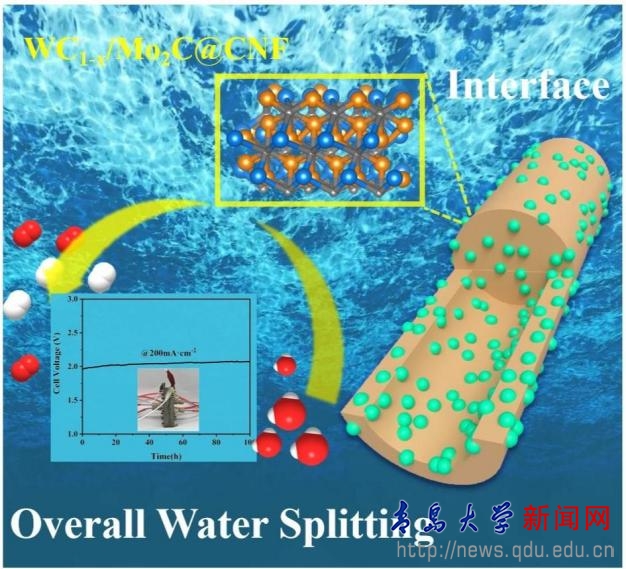 堿性電解(AWE)在實現氫能源經濟中起著至關重要的作用。設計和開發高效穩定的析氫反應(HER)和析氧反應(OER)雙功能催化劑是實現高效堿性電解的關鍵。該文章成功設計并合成了界面豐富的碳化鎢/碳化鉬納米纖維(WC1-x/Mo2C@CNF)。得益于Mo2C到WC1-x的電子轉移行為,WC1-x/Mo2C@CNF電催化劑表現出優異的析氫反應和析氧反應性能。此外,當WC1-x/Mo2C@CNF催化劑用作膜電極組裝裝置的陽極和陰極時,在200 mA cm-2的高電流密度下,WC1-x/Mo2C@CNF催化劑表現出增強的催化活性和100小時的顯著穩定性。實驗表征和理論模擬表明,通過功函數誘導的內建電場導致WC1-x/Mo2C@CNF活性中心的不對稱電荷分布,調控了其d帶中心,并優化氫/氧中間體的吸附強度,從而促進整體水裂解的催化動力學。該研究為設計異質結催化劑高效電解水制氫提供了一種新的策略。