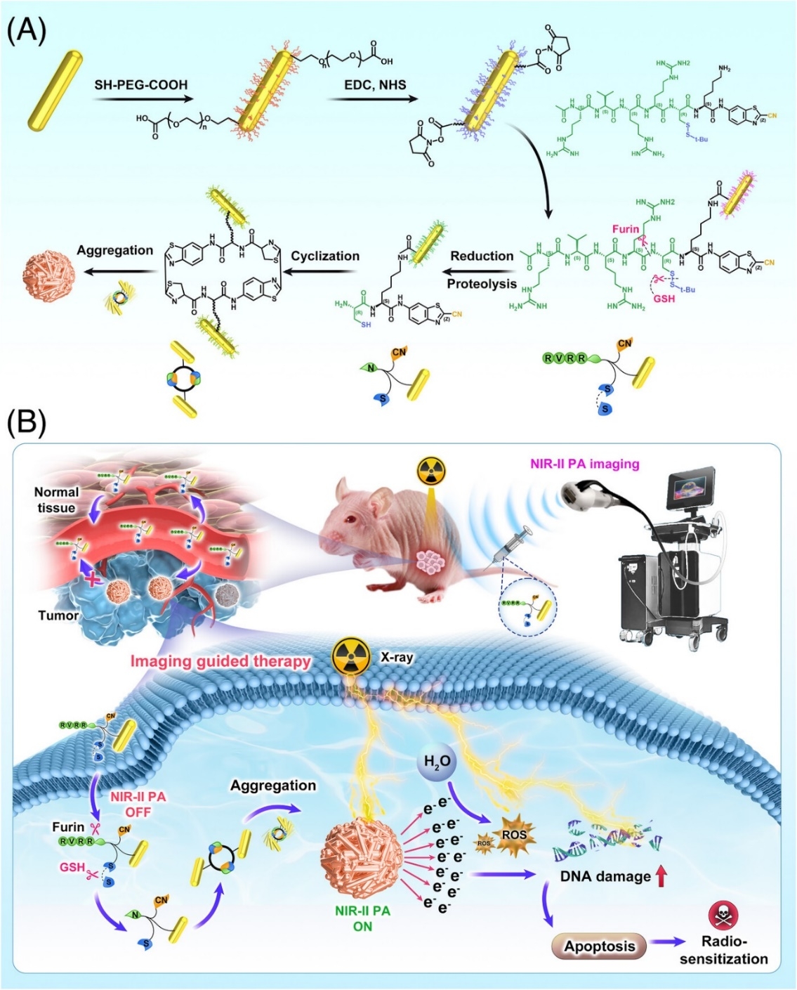 目前的放射治療缺乏準確區分腫瘤組織和健康組織的能力,導致患者遭受嚴重的放射損傷。因此,迫切需要精準的放療技術,以優化腫瘤控制,同時最大限度地減少對周圍健康組織的不良影響。在這項研究中,作者開發了一種由弗林酶響應的RVRR肽偶聯的金納米棒組成的納米藥物(AuNR@Peptide),它將可激活的成像探針和放射增敏劑整合到一個系統中,用于精確的腫瘤定位,實現圖像指導的精準放療。靜脈給藥后,生物標志物(弗林酶)對AuNR@Peptide上的RVRR底物進行蛋白水解,觸發金納米棒組裝成更大的聚集體,由于金納米粒子間的等離子耦合效應從而激活近紅外二區光聲信號,此外,粒徑更大的聚集體通過阻止金納米棒的遷移和回流來增強其瘤內滯留,從而提高其輻射敏感性。注射后在腫瘤部位觀察到近紅外二區光聲信號的峰值時間點可作為啟動X-射線輻射時間點的參考,并通過與放射增敏機制相關的研究闡明增敏機制,體內實驗表明其放療效果有實質性改善。本研究將影像與治療相結合,為腫瘤提供了一種有前景的影像指導治療方式。