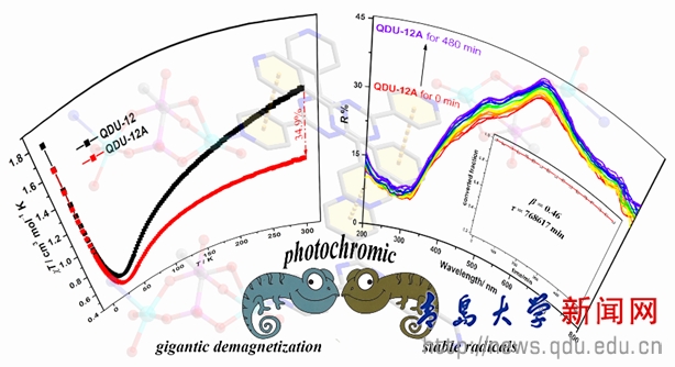 通過(guò)設(shè)計(jì)制備出π共軛配體構(gòu)筑的光致變色材料,利用對(duì)位阻效應(yīng)及分子間π-π堆積作用的調(diào)控,實(shí)現(xiàn)超分子結(jié)構(gòu)中的光生自由基長(zhǎng)達(dá)18個(gè)月的穩(wěn)定存在;并對(duì)Cu(II)離子和自由基間的反鐵磁耦合調(diào)控,實(shí)現(xiàn)了光致變色體系最大的室溫光退磁效應(yīng)。這項(xiàng)工作對(duì)構(gòu)建并穩(wěn)定自由基研究提供了新思路,將有力推動(dòng)光電操控材料領(lǐng)域的發(fā)展。論文第一作者為青年教師胡繼祥和碩士生姜曉帆(共同一作),王國(guó)明教授為論文通訊作者。該研究工作得到國(guó)家自然科學(xué)基金與山東省重點(diǎn)研發(fā)計(jì)劃等的資助。