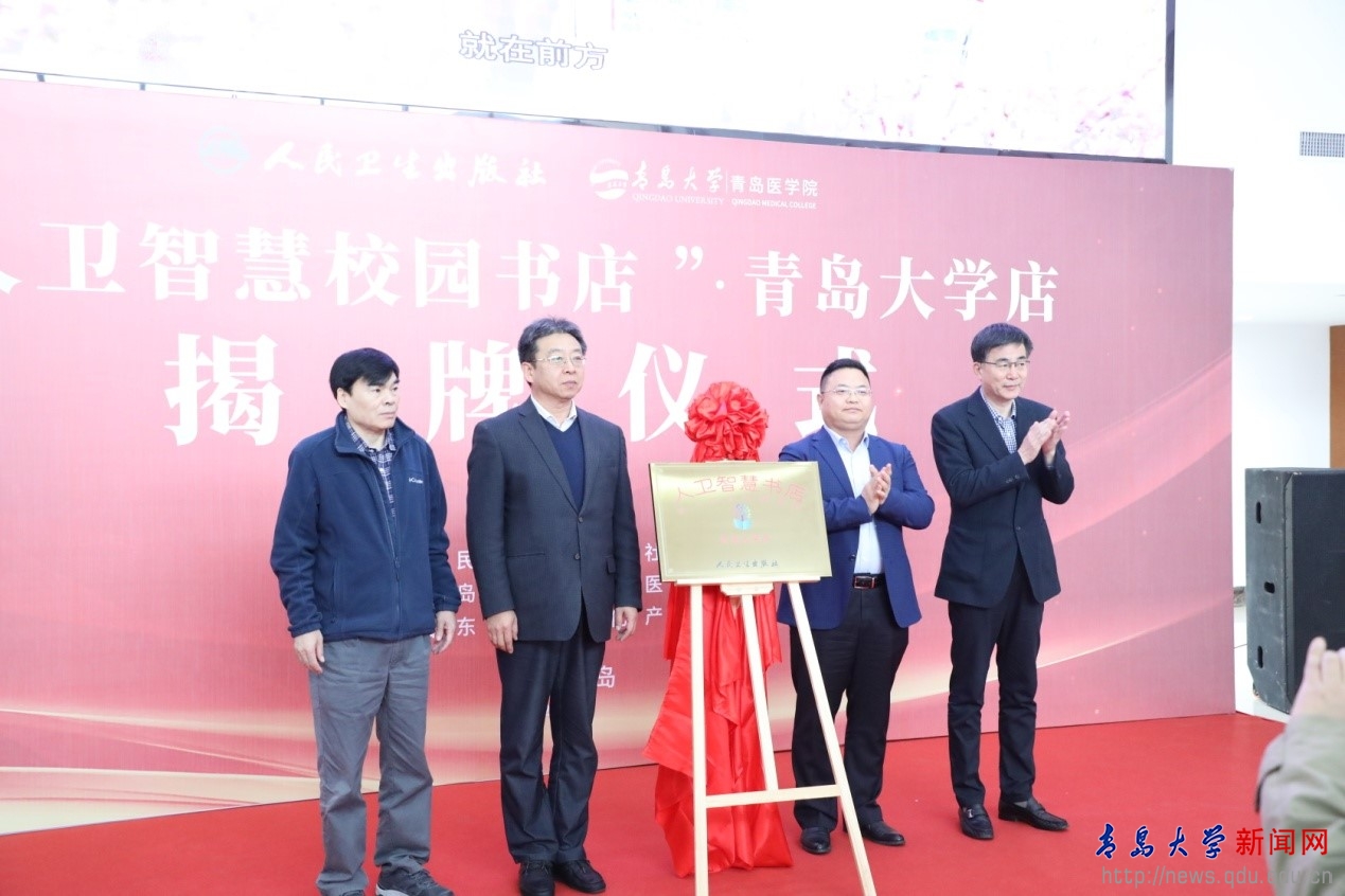 于永明、朱雙龍、王新生、孫同軍共同為“人衛智慧書店”(青島大學店)揭牌。