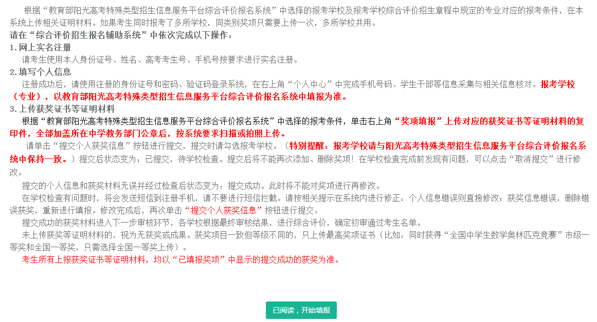 請在“教育部陽光高考特殊類型招生信息服務平臺綜合評價報名系統”完成學校報名后,再進行獲獎證書等證明材料的上傳。報考學校(專業),以教育部陽光高考特殊類型招生信息服務平臺綜合評價報名系統中填報為準。
