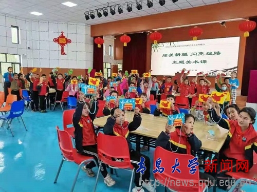 美術學院“繪美新疆,閃亮絲路”南疆藝術扶貧絲路行工作組將準備好的“我愛祖國”、“紅色文化”、“學雷鋒精神”主題背包等各種手工制作材料帶進課堂,為500余名阿亞格喬達村小學生開展中華傳統文化支教活動,制作手工制品;深入皮山縣喬達鄉小學開展國畫藝術課堂,教授孩子們調色畫出寓意各民族緊緊抱在一起的大石榴籽;學院2019級室內班與當地某幼兒園中二班線上一對一結對交流,贈送孩子們“愛心畫作”,實現大手拉小手,民族一家親;為阿亞格喬達村捐贈書畫,助力構建“一家親”愛心書屋和鄉村美術館。