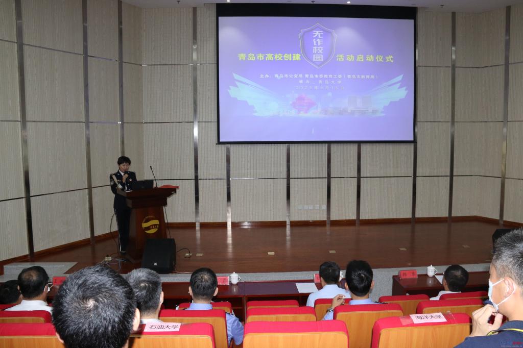 青島大學安全管理處處長陳崇研代表全市高校發出高校開展“無詐校園”創建暨防范電信詐騙的行動倡議,從提高政治站位抓好工作部署落實、發揮高校資源優勢努力營造良好宣教氛圍、加強校警校地聯動提高專業防范能力、積極組織文化宣教活動努力提高宣教活動實效四個方面提出行動倡議。