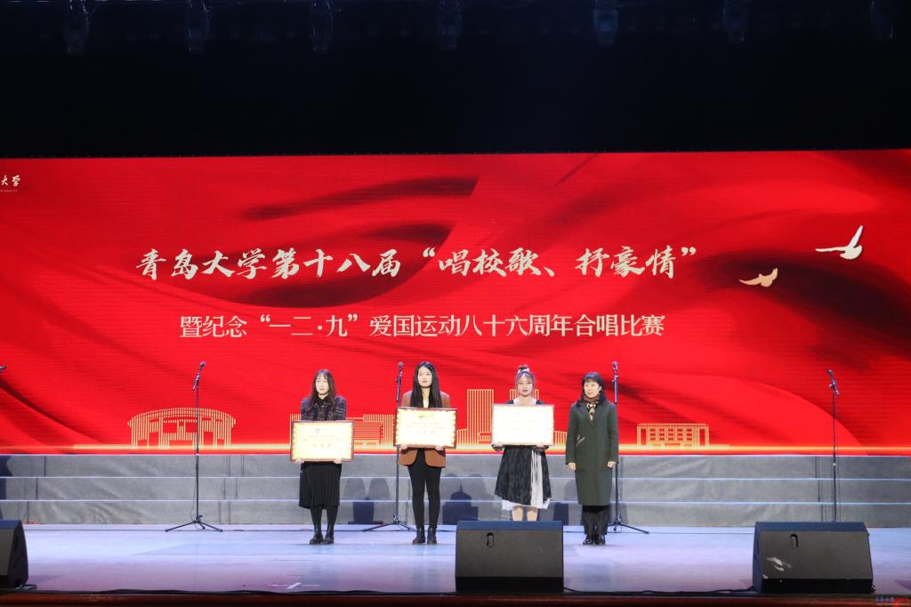新聞網訊 12月4日下午,由共青團青島大學委員會主辦,青島大學大學生藝術團承辦的青島大學第十八屆“唱校歌、抒豪情”暨紀念“一二·九”愛國運動86周年合唱比賽決賽在青大劇院舉辦。校黨委常委、副校長劉彩云出席并頒獎。學校各部門負責人、各院(部)領導,全體團干部和學生代表觀看了比賽。