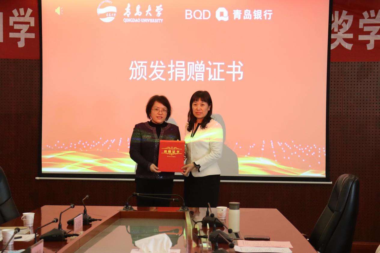 青島銀行自2011年開始在我校設立“青島大學-青島銀行獎學(教)金”,獎勵優秀教師和學生,獎學金每年30萬元,獎教金每年20萬元。截止到2021年,青島銀行已獎勵我校1100名優秀大學生,獎勵金額330萬元。