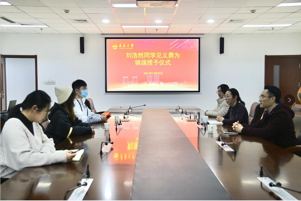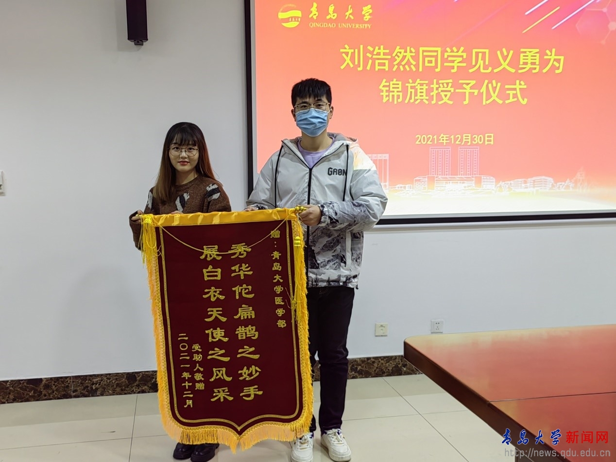 新聞網訊 近日,我校醫學部2017級臨床醫學專業本科生劉浩然見義勇為,救治了一名年過六旬突發心梗的溺水老人。12月30日下午,事發溫泉酒店的工作人員專程來到學校尋找劉浩然,并贈送錦旗并表示感謝。