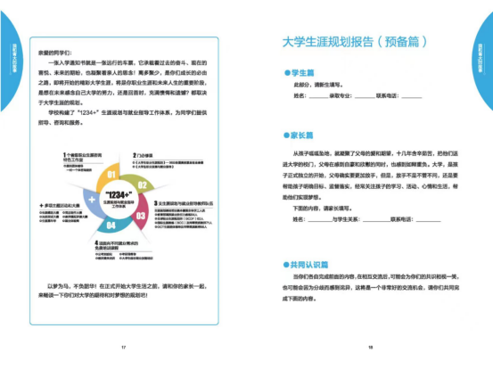學生生涯發展中心按照“全程化”生涯育人理念,設計了《大學生涯規劃報告》(預備篇),引導新生和家長一起思考大學生活,結合新生實際特點,制定科學的大學學業和生涯規劃,輔導員會以此開展新生的學業規劃和生涯啟蒙教育工作,指導新生“規劃自我,決勝未來”。此外,還精心制作了《生涯規劃:在青大成長的N種可能性》網絡課程,呈現大學不同階段的生涯風貌,傳播生涯規劃理念,指導生涯規劃方法。