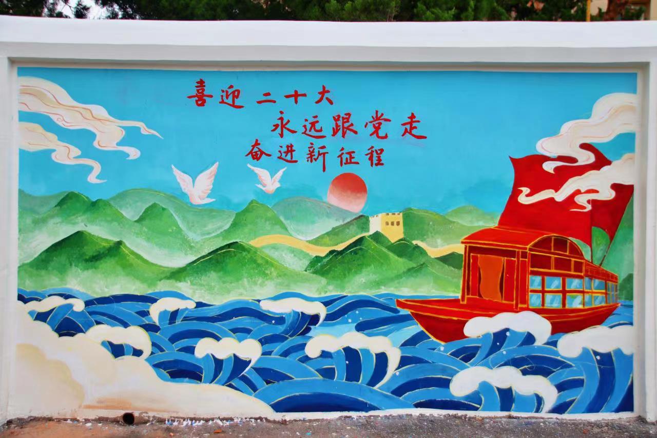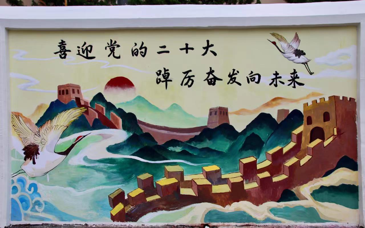 在黨的二十大勝利召開之際,繪就錦繡山河,為美麗校園添彩。青山疊翠,風語耳畔,步步皆景,此幅作品以墻繪切入,將綠水青山融匯到墻繪畫卷中,成為助力環境保護、生態文明建設的獨特載體。
