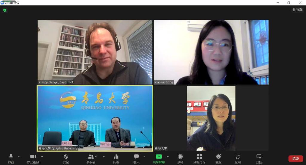 新聞網訊 1月5日下午,設立在我校的山東省中德高校合作中心與德國巴伐利亞州對華高教中心召開線上視頻工作會議。德國巴伐利亞州對華高教中心主任鄧菲力(Philipp Dengel)、德國巴伐利亞州對華高教中心駐北京辦事處主任宋曉瑋與我校國際交流合作處處長、中德中心辦公室主任汪運波及相關工作人員參加了視頻工作會議。