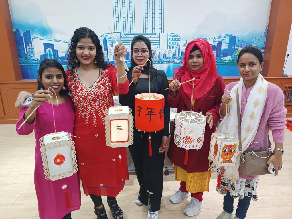 除了體驗寫對聯、貼福字,留學生們還在美術學院民俗愛好者的指導下親手制作了兔年民俗燈籠。兔年民俗燈制作過程完成后,留學生們集體展示了自己的勞動成果。