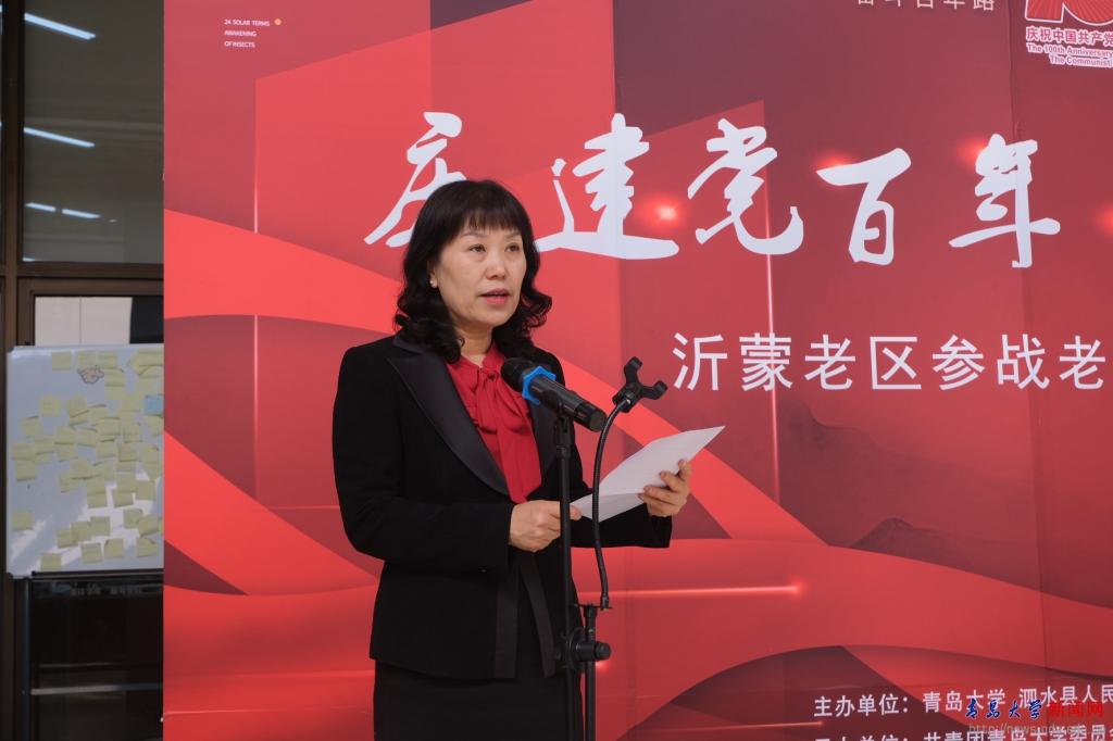 劉彩云在致辭中表示,本次活動是青島大學黨史學習教育的重要環節。她指出,為了歌頌和紀念那些為祖國和人民奉獻青春熱血的英雄,講好他們的紅色故事,傳承他們的偉大精神,青大師生創新性的繪制以沂蒙百位革命老兵為主題的紅色漫畫獻禮建黨百年,以緬懷沂蒙老區革命英雄的豐功偉績,青大青年要承擔歷史責任,奮發有為,為中華民族偉大復興貢獻青春力量。