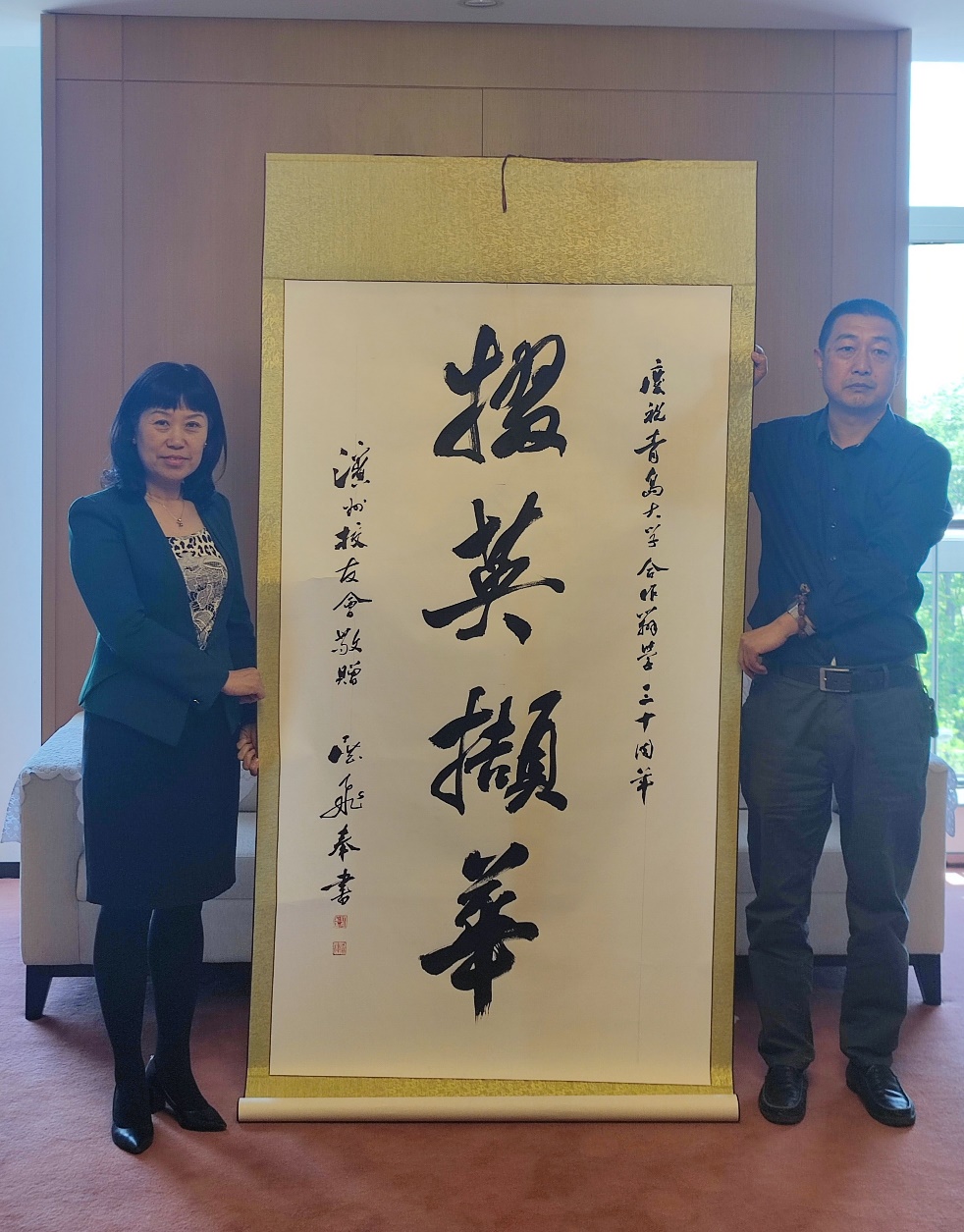 王世民會長向母校作了深情匯報。濱州校友會自成立以來,校領導多次蒞臨濱州校友會視察交流,給予校友會殷切關懷和指導。校友會積極組織校友開展活動,凝心聚情,成為濱州青大校友移動的家園。值母校合并辦學30周年,濱州校友會特邀中書協會員、中央國家機關書協常務理事、中國糧食書協常務副主席兼秘書長、著名書法家展飛先生題寫巨幅書法禮品《掇英擷華》。“掇(duo)英擷(xie)華”四字,語出清黃宗羲《明文案序上》,寓意多層:既有青大四校合一汲取精華、又含為國育人擷取精英之意。祝愿母校蒸蒸日上,為國家培養更多優秀棟梁人才。