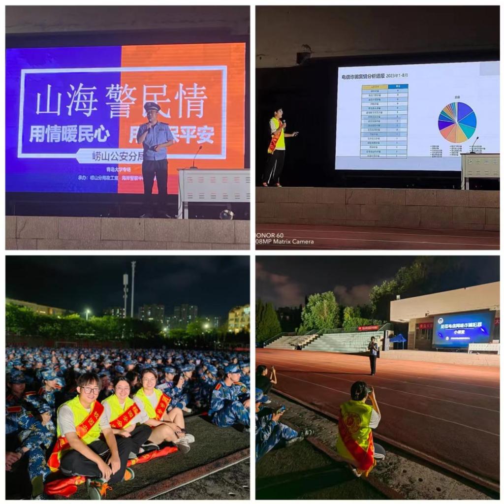 新聞網訊 9月5日晚,青島市公安反詐中心、海岸警察支隊中韓派出所、校黨委保衛部把反詐課堂搬進軍訓操場,共同為2023級新生帶來一堂“干貨滿滿”的安全教育課。