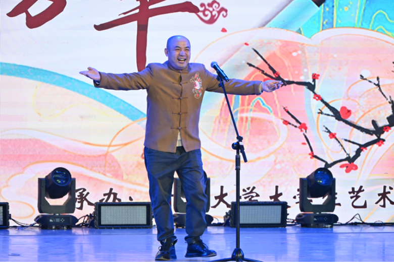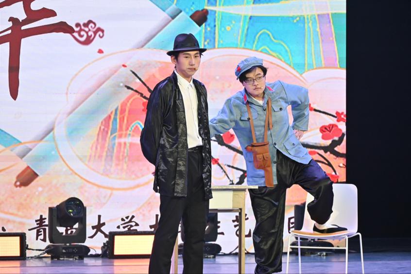 比賽中,戲曲《牡丹亭·游園》戲腔婉轉;相聲《羅密歐與朱麗葉》別具一格;小品《斷片》奕奕傳神,選手們精心編排、傾心演繹,以滿腔的熱情描摹青大青年昂揚的姿態。這些作品中有幽默詼諧的段子,也有感人至深的情節,選手們精湛的技藝和獨特的表演風格贏得了現場觀眾的陣陣掌聲。決賽現場由大學生藝術團表演的器樂合奏《象王行》和群舞《灼灼芳華》給觀眾帶來更加豐富多彩的觀賽體驗,由青島市歌舞劇院說唱團國家二級演員李強帶來的嘉賓節目山東快書《打撲克》更是生動展現了經典曲藝作品的魅力。