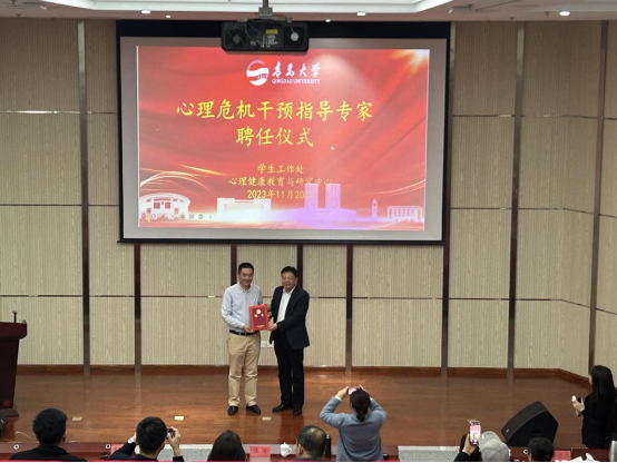 培訓會上,陳濤為唐海波教授頒發“心理危機干預指導專家”聘書。