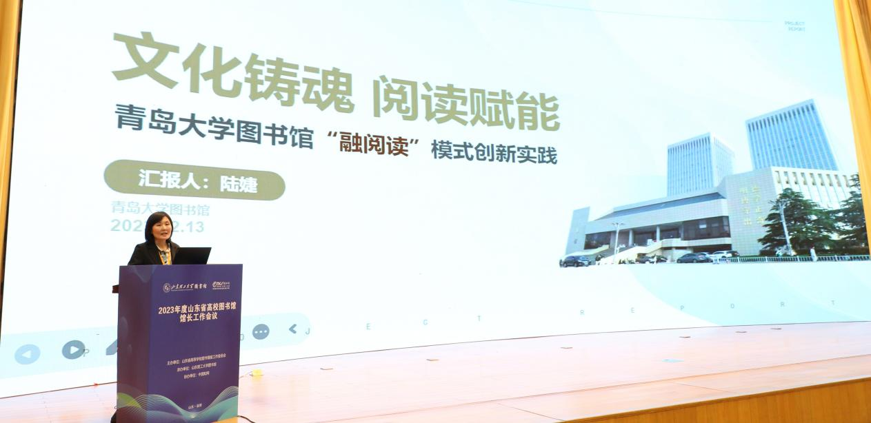 陸婕主持主會場報告,并以《文化鑄魂閱讀賦能——青島大學圖書館“融閱讀”模式創新實踐》作專題報告,分享我校圖書館重組閱讀資源、重組閱讀空間、構建三館融合的閱讀模式和打造融閱讀文化品牌、實現文化鑄魂的育人模式。編目部主任、副研究館員秦洪晶在分會場作了《同頻才能共振——文獻資源建設助力學科發展經驗分享》的工作經驗交流發言,利用大量的數據對我校圖書館的文獻資源建設與利用情況進行了介紹。