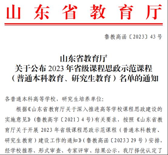 新聞網訊 近日,山東省教育廳公布了2023年省級課程思政示范課程名單,我校9門課程獲批立項,其中普通本科教育課程8門、研究生教育課程1門。