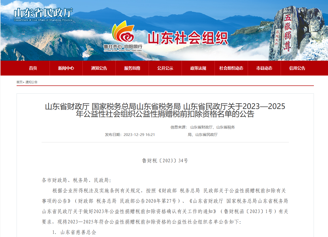 新聞網(wǎng)訊 近日,山東省財(cái)政廳、國家稅務(wù)總局山東省稅務(wù)局、山東省民政廳聯(lián)合發(fā)布《關(guān)于2023年度—2025年度公益性社會(huì)組織捐贈(zèng)稅前扣除資格等有關(guān)名單的公告》(魯財(cái)稅〔2023〕34號(hào)),我校教育發(fā)展基金會(huì)名列其中,獲得2023年度-2025年度公益性捐贈(zèng)稅前扣除資格。