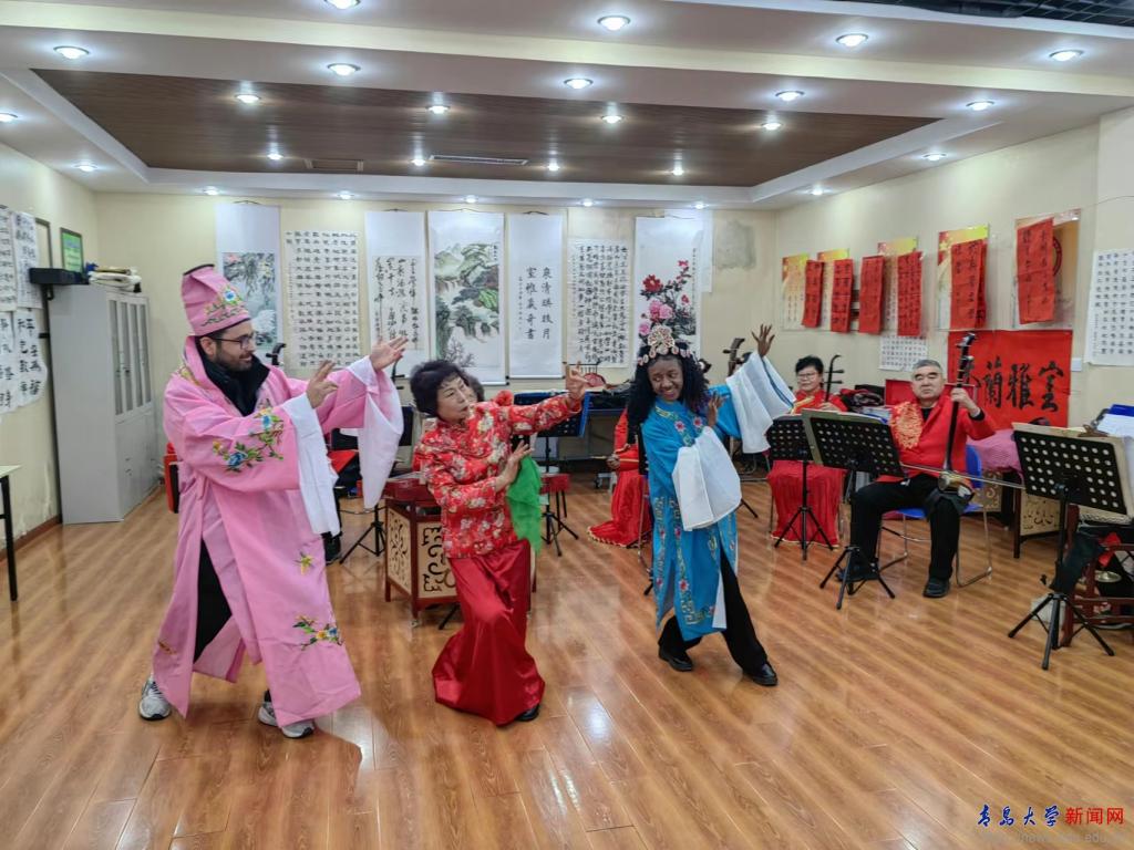 留學生們在老年書法家的指導下書寫出一張張屬于自己的專屬“?!弊?,體驗濃濃的中國年味。一副副對聯、一張張“福”字讓整個現場墨香滿溢,濃濃的年味撲面而來。留學生們還在民間藝人的指導下,體驗了剪紙、年畫拓印制作、扎染、捏糖人等民俗活動,并欣賞了九水路街道民族樂團演奏,在欣賞演出的同時,還近距離參觀體驗了地方戲呂劇演出的配飾、服飾、演出道具。
