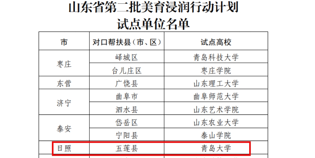 新聞網訊 近日,山東省教育廳公布了山東省第二批美育浸潤行動計劃試點單位名單,共20所省屬高校入圍,我校名列其中,對口幫扶日照市五蓮縣,雙方將充分發揮各自資源優勢,探索構建高校與城鄉學校之間“手拉手”相互學習交流和幫扶機制。