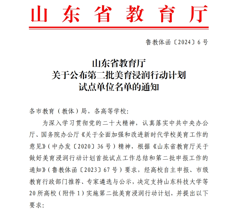 2023年12月,教育部發布《關于全面實施學校美育浸潤行動的通知》(教體藝〔2023〕5號), 提出以美育浸潤學生、以美育浸潤教師、以美育浸潤學校,推動形成全覆蓋、多樣化、高質量具有中國特色的現代化學校美育體系的建設任務。近年來,我校高度重視美育工作,將美育納入學校整體發展規劃,制定加強美育工作的實施方案,成立公共美育中心,構建由美育核心課程、美育選修課程和美育實踐活動組成的美育教育體系。依托學校170余間藝術場館,打造科技文化藝術節、星火藝術展演、浮山美育論壇等美育活動品牌。堅持課堂教學、課外活動、校園文化、藝術展演四位一體實施模式,將“以美育人、以美化人、以美培元”理念納入人才培養全過程。 此次獲批省級美育浸潤行動計劃試點高校,是對我校美育工作的充分肯定和鼓勵,我校將以此次獲批為契機,落實建設任務,在美育課程教學、美育實踐活動、校園文化建設、美育教師隊伍建設等方面為對口單位提供精準幫扶“菜單”,搭建創新協同合作機制,為激發美育教育教學改革發展內驅力、推進學校美育工作整體提升貢獻青大力量。