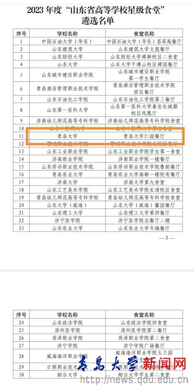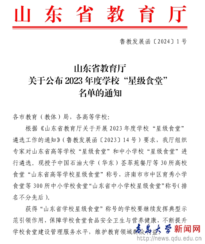 新聞網訊 近日,山東省教育廳下發了《關于公布2023 年度學校“星級食堂”名單的通知》,我校仁園餐廳獲評“山東省高等學校星級食堂”榮譽稱號。