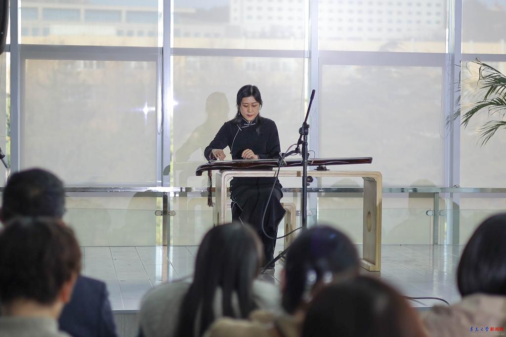 “湖畔博雅課”是青島大學浮山書院于2024年春季學期全新開啟、面向全校師生公益開放的文化素質教育第二課堂。“琴·簫·箏”是“湖畔博雅課”中的非遺傳承系列。在開課典禮的音樂會上,青島民族管弦樂學會副會長、青島琴會會長趙霄鵬,古箏專業委員會副會長戰鵬程,古箏專業委員會理事官賽,古琴專業委員會理事于月為現場觀眾講解了古琴、古箏的歷史與樂器特點,獻上了古琴獨奏《流水》《半山聽雨》,古箏二重奏《蝴蝶與藍》《訣別書》以及琴箏四重奏《清平樂》,未能來到現場的劉伽老師也以視頻方式給大家講解了琴簫與洞簫的區別,并為大家演奏了《梅花三弄》。老師們的精彩講解與演奏激起了觀眾們的熱烈掌聲。
