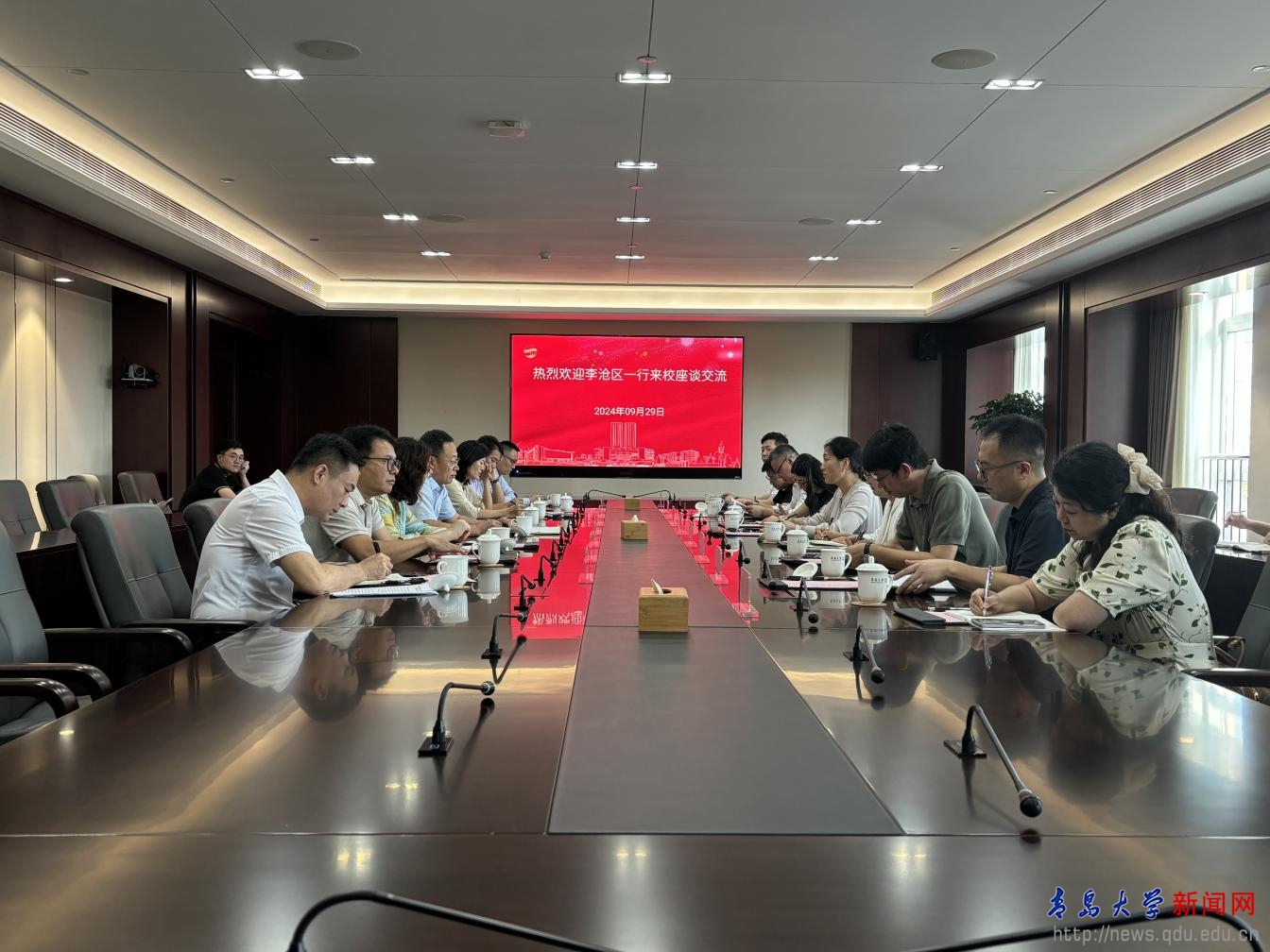李滄區科技局副局長王磊,中心醫院、金水集團、華瀾集團、魏橋智行、青島中檢紡織品檢驗有限公司、仟象春數字經濟產業基地、青島泰德汽車軸承股份有限公司、青島方天科技股份有限公司等負責同志,學校科技處、合作發展處、人力資源處、科研成果轉化中心、青島醫學院、教育集團主要負責人參加座談。
