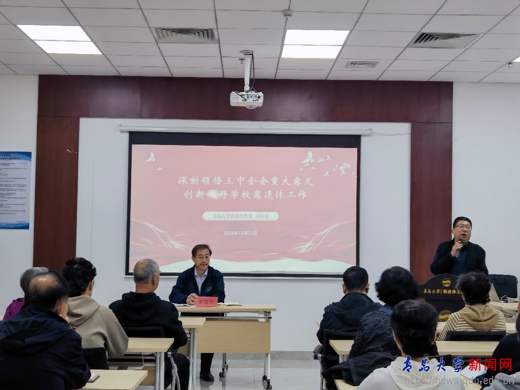 新聞網訊 10月21日上午,離退休黨委在文化藝術樓B203召開黨委理論學習中心組擴大會議,集體學習黨的二十屆三中全會精神,離退休黨委書記、處長宋佐東作輔導報告,離退休黨委副書記、副處長周志強主持會議,離退休黨委各黨支部書記、支部委員,離退休處全體工作人員共計70余人參會。