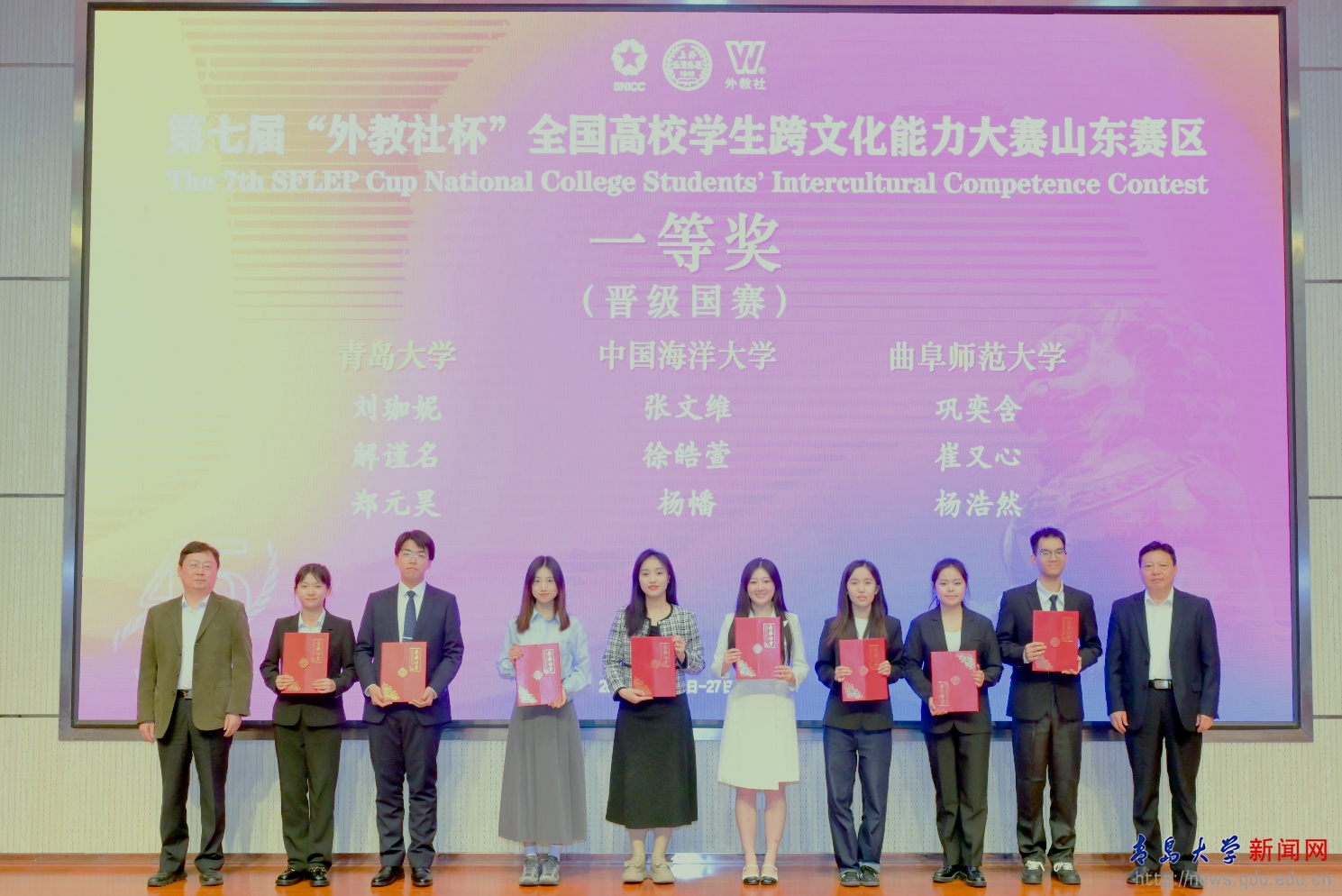 新聞網(wǎng)訊 10月26日至27日,第七屆“外教社杯”全國高校學(xué)生跨文化能力大賽山東賽區(qū)復(fù)賽和決賽在青島舉行。由我校外語學(xué)院劉珈妮、青島醫(yī)學(xué)院解謹(jǐn)名和外語學(xué)院鄭元昊組成的青島大學(xué)團(tuán)隊(duì)榮獲一等獎(jiǎng),晉級國賽。公共外語教育學(xué)院秦丹雪、蔣功艷和外語學(xué)院呂凱良擔(dān)任指導(dǎo)教師。
